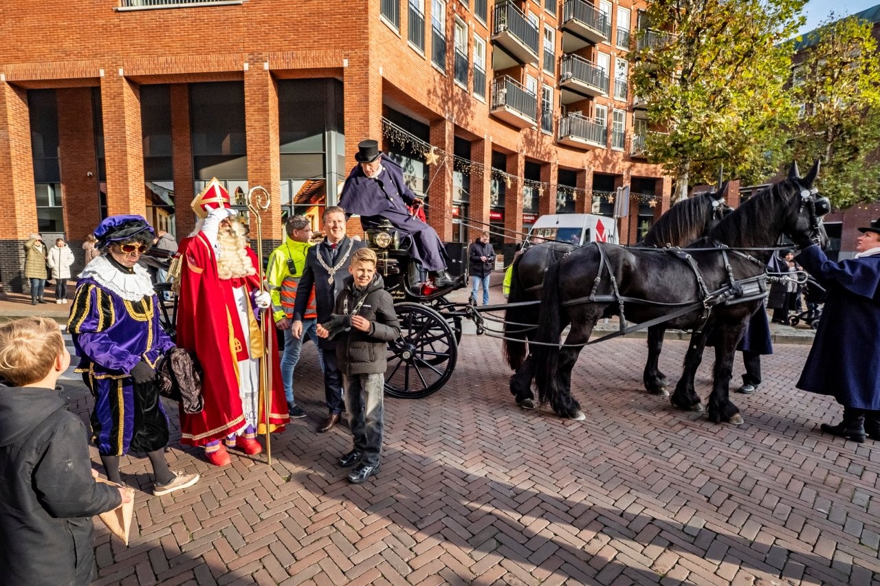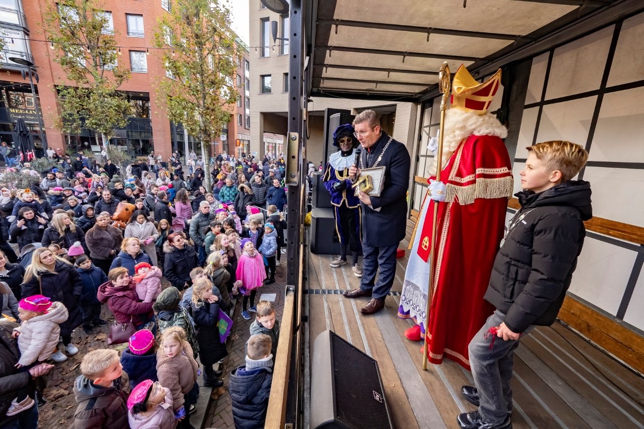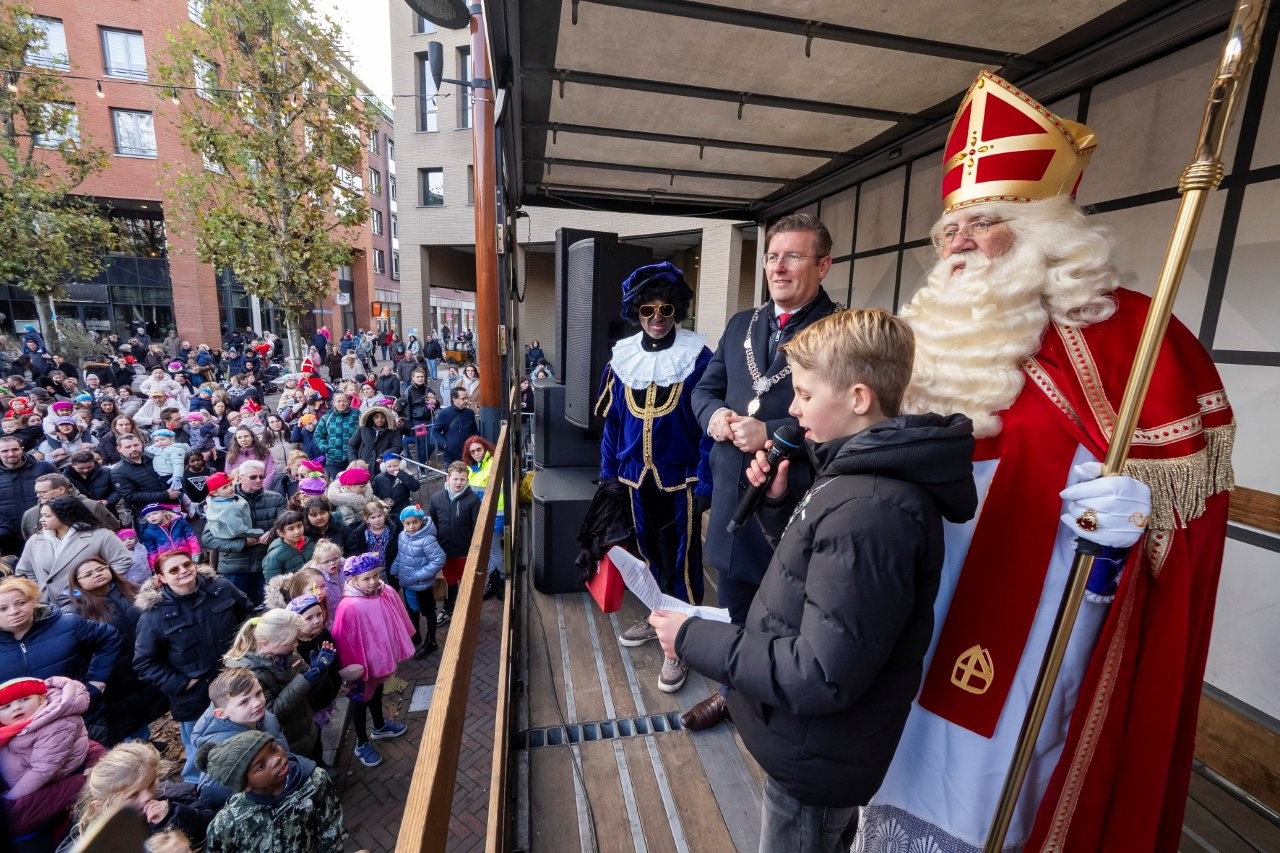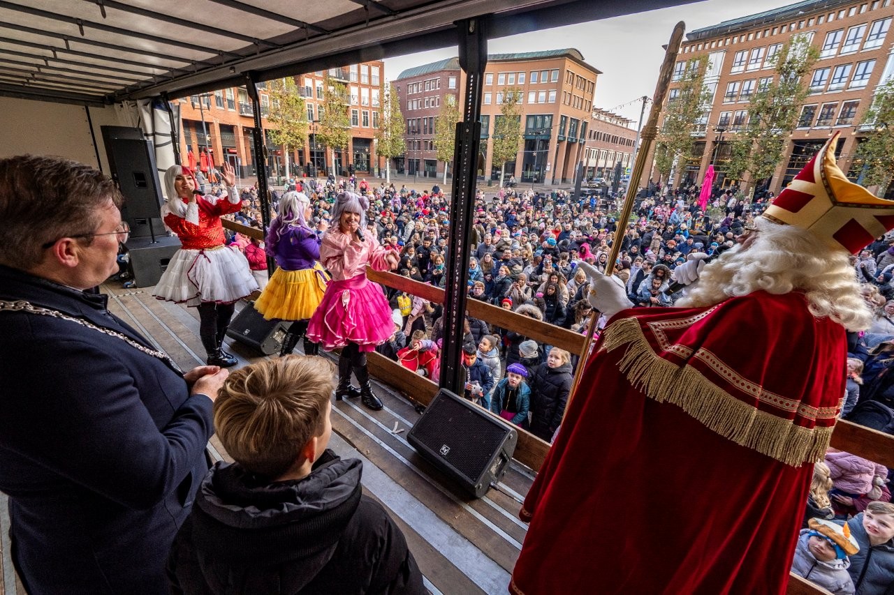 Na aankomst in Slikkerveer vertrok de Sint, samen met de burgemeester en de kinderburgemeester, richting het Koningsplein om daar het feest voort te zetten.